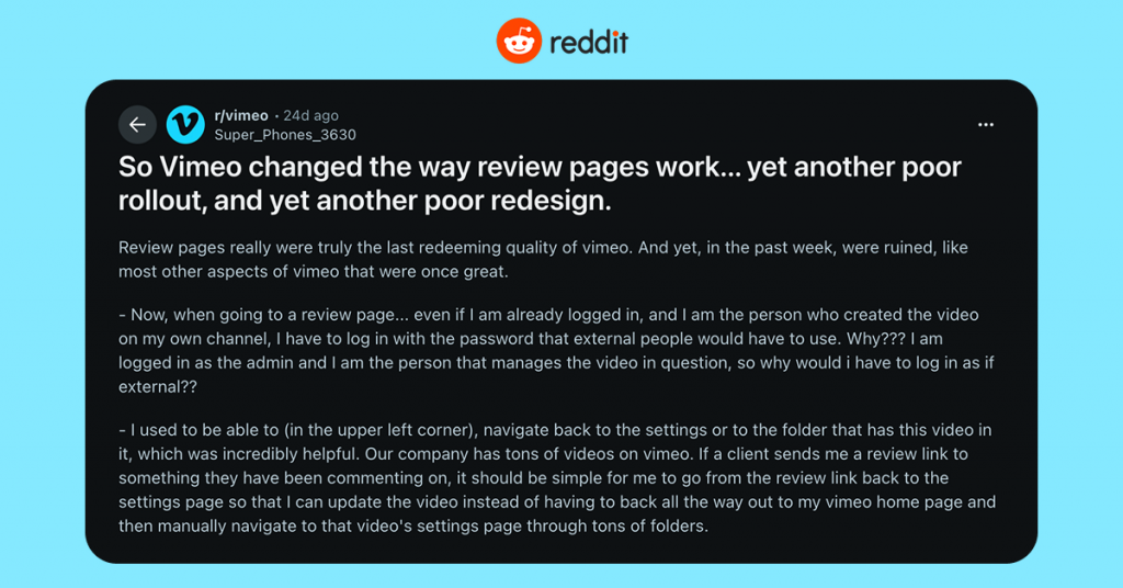 The most common frustrations? Steep pricing tiers, storage limitations, holding videos hostage, and the recent infamous Vimeo acquisition by Bending Spoons (the European software company).